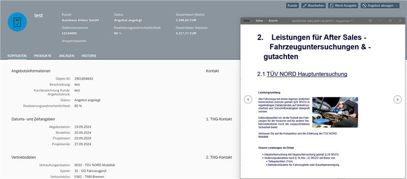 - automatisches Ausfüllen der Angebotsvorlage, mit der Möglichkeit diese manuell zu bearbeiten
